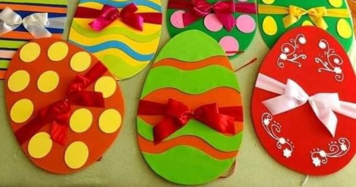 Μία άλλη επιλογή για Πασχαλινή κατασκευή είναι και η παρακάτω. Κόψτε Πασχαλινά αυγά από χαρτόνι και άσε τα παιδιά να τα διακοσμήσουν όπως αγαπάνε. Μπορούν να τα χρωματίσουν με μαρκαδόρους ή με τέμπερες, να χρησιμοποιήσουν γκλίτερ, κορδέλες και φιόγκους, ακόμη και ανακυκλώσιμα υλικά όπως καπάκια από μπουκάλια.
