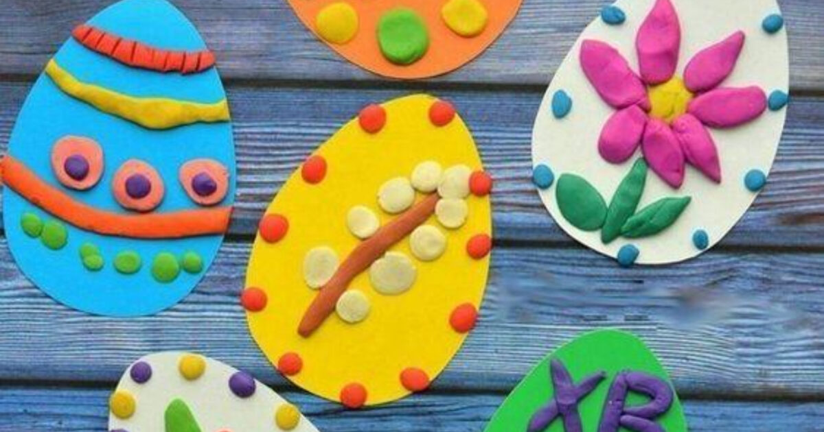 Για την παρακάτω κατασκευή δε θα χρειαστείς πολλά πράγματα. Λίγα χρωματιστά φύλλα χαρτονιού και πλαστελίνη. Αφού σχεδιάσεις το σχήμα των αυγών σε οποιοδήποτε χρωματιστό χαρτόνι επιθυμείς, βάλε τα παιδιά να το διακοσμήσουν χρησιμοποιώντας το αγαπημένο τους παιχνίδι: την πλαστελίνη.